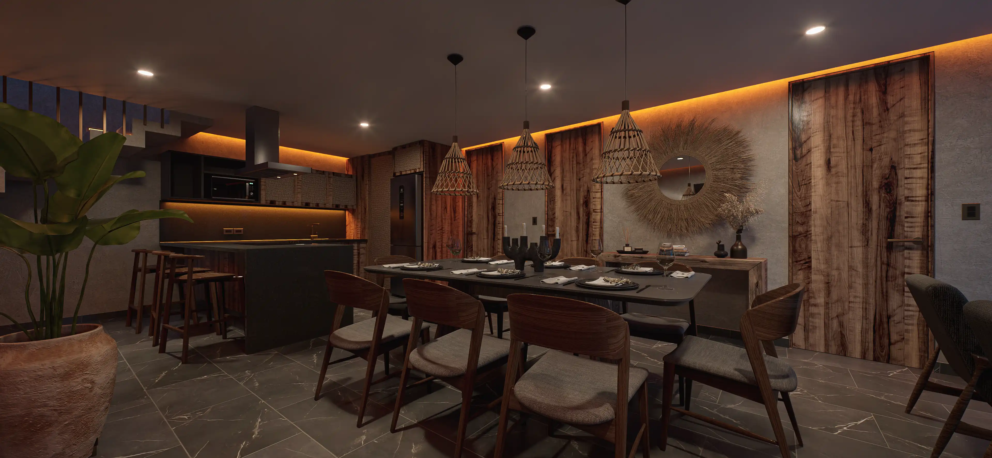El interior refleja elegancia a través de espacios mejorados con materiales regionales.